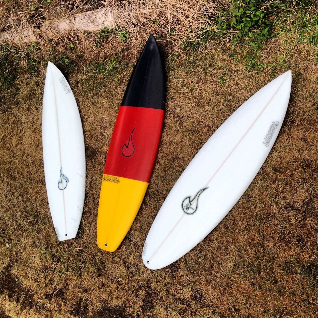 | The bottom has a deep/pronounced vee going all way the through the back third of the board. The fins are far enough back to ride as a twin fin and still spread enough for tri or quad! |